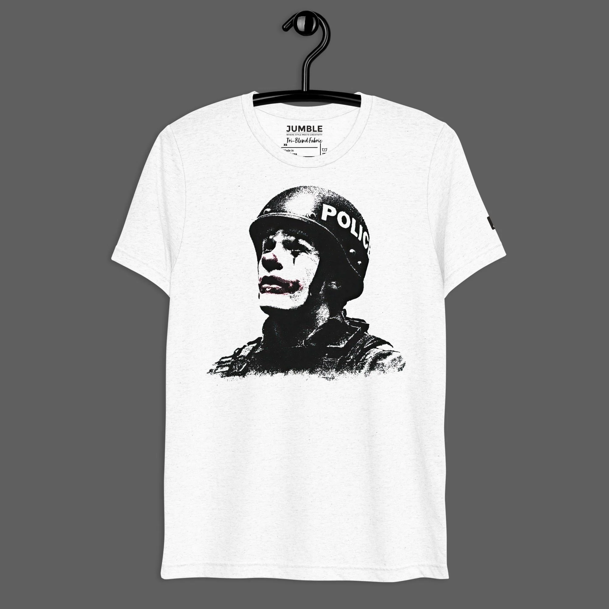 Circus of Control is a stark black-and-white portrait that turns authority into performance—clean, gritty, and deliberately uncomfortable. The helmet, the smeared clown paint, and that fixed upward stare create a tension you can’t unsee: order on the outside, chaos underneath. It’s minimal at first glance, then hits harder the longer you look.